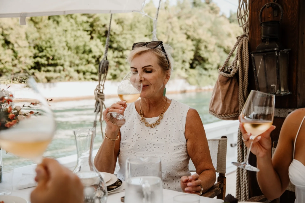 Durante la navigazione potrai assaporare una selezione di vini bianchi, rossi e rosati scelti dal nostro sommelier tra le migliori cantine locali, italiane e internazionali, con abbinamenti dedicati ai piatti serviti a bordo. Per i bambini e per chi lo desidera, sono disponibili anche bevande analcoliche, succhi di frutta e proposte pensate per i più giovani.