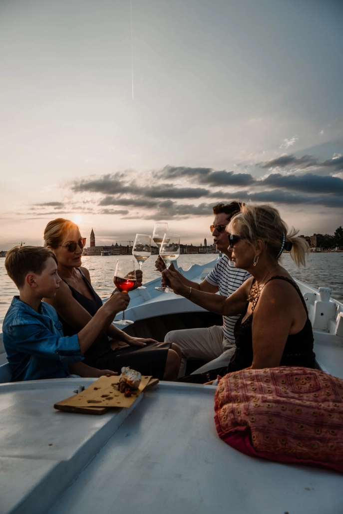 Organizza una cena a bordo di una barca ad uso esclusivo e vivi con la tua famiglia la magia della laguna di Venezia, ammirando Piazza San Marco illuminata dalle luci del tramonto.