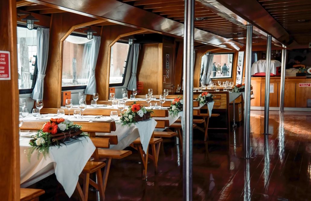 Organizzare una festa di natale corporate su barca a Venezia è un’idea originale e coinvolgente: potrai pianificare un pranzo, una cena e una festa musicale anche d’inverno nella laguna. Ti guideremo nella selezione della barca riscaldata più adatta, proponendo soluzioni su misura che includono catering, intrattenimento musicale e altris servizi.