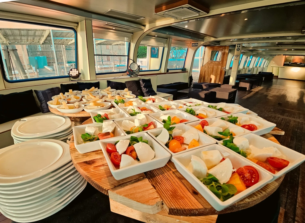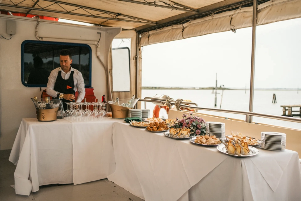 Organizza un evento informale o aperitivo con catering a buffet a bordo di una barca nella splendida cornice di Venezia.